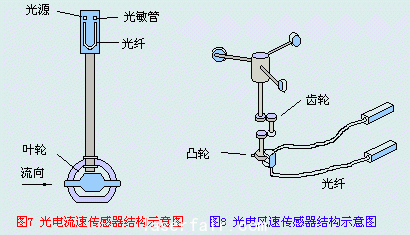 圖8示出,風(fēng)帶動(dòng)風(fēng)速計(jì)旋轉(zhuǎn),經(jīng)齒輪傳動(dòng)后帶動(dòng)凸輪成比例旋轉(zhuǎn)。光纖被徒輪輪番遮斷形成一串光脈沖,經(jīng)光電管轉(zhuǎn)換成定信號(hào),經(jīng)計(jì)算可檢測(cè)出風(fēng)速。