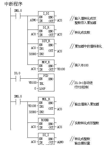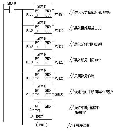 過(guò)程變量值是壓力變送器檢測(cè)的單極性模擬量,回路輸出值也是一個(gè)單極性模擬量用來(lái)控制鼓風(fēng)機(jī)的速度。這兩個(gè)模擬量的范圍是 0.0 -1.0 ,分辨率為1/32000 (標(biāo)準(zhǔn)化)??梢猿醪酱_定Kc=0.06,Ts=0.2,Ti=10.0,在這里不用微分作用,程序編輯如下圖。