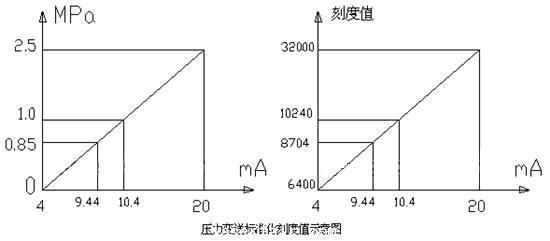 在本套系統(tǒng)中,為了生產(chǎn)需求,鍋爐內(nèi)蒸汽壓力應(yīng)維持在0.85-1.0MPa之間,壓力的大小由壓力變送器檢測(cè),變送器壓力量程0-2.5MPa,輸出DC4-20mA。因此在0.85MPa時(shí),相應(yīng)的電流輸出是9.44Ma,同樣1.0MPa時(shí)輸出為10.4mA,其標(biāo)準(zhǔn)化刻度值如下圖所示。