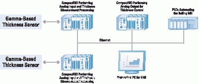 每個(gè)軋制機(jī)器都帶有三個(gè)形成網(wǎng)絡(luò)的CompactRIO系統(tǒng)。這三個(gè)系統(tǒng)都是智能節(jié)點(diǎn),能利用一個(gè)工業(yè)標(biāo)準(zhǔn)Modbus/TCP、TCP/IP或UDP協(xié)議進(jìn)行通信。其中有兩個(gè)系統(tǒng)與伽馬級(jí)傳感器連接,并進(jìn)行模擬輸入測(cè)量和高級(jí)處理,來(lái)計(jì)算精確厚度測(cè)量值。