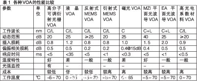 隨著VOA在光通信中的應(yīng)用越來越多,對(duì)其功能的要求也越來高。VOA應(yīng)能精確地控制光信號(hào)的功率,為所有通信波長(zhǎng)提供穩(wěn)定的衰減量;在超長(zhǎng)距離DWDM系統(tǒng)中,VOA還必須對(duì)隨環(huán)境影響而逐漸變化的信號(hào)有反應(yīng);在動(dòng)態(tài)網(wǎng)絡(luò)節(jié)點(diǎn)上,VOA的響應(yīng)時(shí)間應(yīng)在ms級(jí)。VOA的技術(shù)指標(biāo)主要包括:工作波長(zhǎng)范圍、動(dòng)態(tài)范圍、插入損耗、偏振相關(guān)損耗、響應(yīng)時(shí)間、溫度特性、工作溫度等。下面就各種技術(shù)做一簡(jiǎn)單比較,見表1。#p#分頁(yè)標(biāo)題#e#