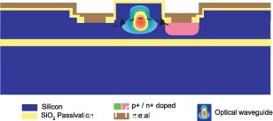 另一種直接基于電吸收(EA)調(diào)制,利用載流子注入改變吸收系數(shù)來實(shí)現(xiàn)光功率的衰減。如圖7所示,在PN結(jié)之間加入一層單模光波導(dǎo)層,當(dāng)未加電時(shí),從光纖出射的單模光,進(jìn)入單模光波導(dǎo)層后,仍然是傳導(dǎo)模,被限制在這一層中繼續(xù)傳播,并從另一光纖輸出;當(dāng)加載電壓時(shí),由于載流子的注入,單模光波導(dǎo)的吸收系數(shù)增大,從而部分光被吸收掉。并且隨著電壓的增加,流過PN結(jié)的電流也隨著增加,使得更多的光子被吸收,衰減增大。