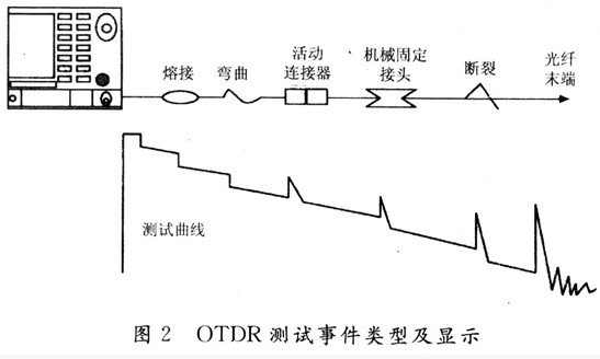 OTDR位置仍同“前向單程”監(jiān)測,但在接續(xù)方向的始端將兩根光纖分別短接,組成回路。這種方法即可滿足中繼段光纖測試,也可對光纖接續(xù)進(jìn)行監(jiān)測。對中繼段光纖測試可以在光時域反射儀的顯示屏上很清楚地看到入射光脈沖、反射光脈沖、接頭點、斷裂點、故障點以及衰減分布曲線。OTDR測試事件類型及#p#分頁標(biāo)題#e#顯示如圖2所示,它可以為光纜維護(hù)提供方便。