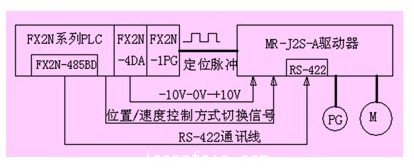 在圖3中,fx2n系列plc為主控制器,擴(kuò)展特殊模塊fx2n-1pg為定位模塊,其輸出為頻率和脈沖數(shù)可控的定位脈沖。當(dāng)plc主系統(tǒng)通過通訊方式獲得伺服電機(jī)當(dāng)前位置的前提下,能在定位指令的驅(qū)動(dòng)下,驅(qū)動(dòng)伺服電機(jī)到給定位置;擴(kuò)展特殊模塊fx2n-4da模擬量輸出模塊,其輸出為0到正負(fù)10v的電壓信號(hào);fx2n-485bd為485通訊卡,它和mr-j2s-a伺服驅(qū)動(dòng)器的rs-422相連;fx2n主機(jī)通過485bd-rs422口與伺服驅(qū)動(dòng)器進(jìn)行通信,讀取伺服電機(jī)的當(dāng)前絕對(duì)位置。當(dāng)處于位置控制方式時(shí),電機(jī)由fx2n-1pg定位模塊發(fā)出的定位脈沖來控制,包括其運(yùn)轉(zhuǎn)速度和目標(biāo)位置。當(dāng)位置/速度切換信號(hào)有效時(shí),伺服驅(qū)動(dòng)器切換為速度控制方式,由模擬量模塊輸出的0到正負(fù)10v來控制其速度大小和運(yùn)動(dòng)方向。安裝在plc主機(jī)上的485通訊卡與伺服驅(qū)動(dòng)器上rs-422口進(jìn)行通訊,隨時(shí)讀取伺服電機(jī)的當(dāng)前絕對(duì)位置值。
