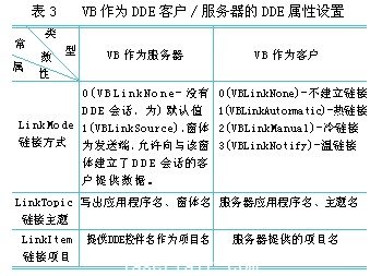 在利用vb開發(fā)dde客戶/服務(wù)器應(yīng)用程序中,欲建立dde鏈接,完全依賴對(duì)象的dde屬性設(shè)置。vb分別作為dde客戶和dde服務(wù)器時(shí),dde屬性的不同設(shè)置(見表3)。