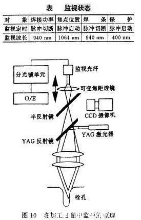 圖10示出監(jiān)視頭的構(gòu)成。監(jiān)視時(shí),以光軸和同軸抽出焊接狀況的圖像,同時(shí)分光、探測(cè)焊接部的發(fā)光。為了使熔深加深,采用脈沖振蕩。根據(jù)焊接狀況圖像,對(duì)熔池形狀和焊接坡口線位置進(jìn)行圖像處理,并向操作人員提供視覺信息。焊接部的發(fā)光抽出,與以前所實(shí)施的采用多條監(jiān)視光纖的方法對(duì)應(yīng),因?yàn)?/font>焊接頭所要求的空間制約條件并不嚴(yán)格,用一根監(jiān)視光纖把用半反射鏡分出的光抽出。下表中示出焊接部發(fā)光的抽出方法。這里采用的是在抽出焊接參數(shù)、激光器輸出、焦點(diǎn)位置變化的同時(shí),探測(cè)穿透焊接時(shí)內(nèi)部波穩(wěn)定性和焊接保護(hù)狀況。
