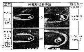 圖17示出相對(duì)#p#分頁標(biāo)題#e#焊接坡口縫隙余量的同軸TIG-YAG激光焊接的結(jié)果。僅用YAG時(shí)焊接坡口縫隙為0.4mm時(shí),會(huì)產(chǎn)生咬邊。而同軸TIG-YAG激光焊接時(shí)焊接坡口縫隙可達(dá)0.8mm。圖18示出根據(jù)焊接焊道的斷面研究氣孔發(fā)生狀況的結(jié)果。因?yàn)楸Wo(hù)氣體中使用了Ar,所以僅采用YAG時(shí)不可避免在部分焊道中產(chǎn)生氣孔。而同軸TIG-YAG激光焊接可以控制氣孔的發(fā)生,如圖19所示,這是因?yàn)橥STIG-YAG激光焊接比單用YAG時(shí)栓孔上部的孔徑大,金屬蒸汽容易排出。