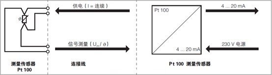 溫度的測量是通過測量電阻來確定的。Pt 100電阻溫度計(jì)在0 °C時的電阻為100 Ω。此值會隨溫度而改變,其變動大約為0.4 Ω/K。為了測量溫度,施加了一個恒定的獨(dú)立電流源(測量電流),它在電阻溫度計(jì)上產(chǎn)生電壓降和溫度成正比。為了防止電阻溫度計(jì)由于測量電流而引起自身發(fā)熱,測量電流被限制為1 mA。在這種情況下,0 °C時Pt 100上的電壓降為100 mV。這個現(xiàn)場測量值必須被傳送到顯示器或處理器。在Pt 100測量傳感器到測量轉(zhuǎn)換器的各種連接方式中,四線連接是其中的一種典型、最佳連接方式。通過這種接線,排除了導(dǎo)電電阻及其溫度波動對測量結(jié)果的干擾。Pt 100電阻溫度計(jì)由外部電源供電。導(dǎo)電電阻的變化可由電源電壓的調(diào)節(jié)自動補(bǔ)償。如果導(dǎo)電電阻不變,則測量得到的電壓Um也保持不變。這些測量電壓,僅隨溫度引起的電阻變化而改變,并在測量轉(zhuǎn)換器的高電阻轉(zhuǎn)換裝置處獲得其測量值。因此,在此連接方式中沒有必要使用線補(bǔ)償。