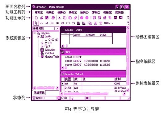 由于20pm主機(jī)結(jié)合了plc順序邏輯控制及雙軸插補(bǔ)定位控制的功能,因此在程序架構(gòu)上主要分為o100主程序、ox運(yùn)動(dòng)子程序及pn子程序等三大類,結(jié)合了基本指令、應(yīng)用指令、運(yùn)動(dòng)指令及gcode指令,使程序設(shè)計(jì)更多元化,結(jié)構(gòu)更清晰;程序采用pmsoft軟件進(jìn)行編輯,參見圖4。