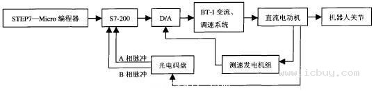 系統(tǒng)采用SIEMENS7-200型PLC,外加D/A數(shù)模轉(zhuǎn)換模塊,將PLC數(shù)字信號變成模擬信號,通過BT―I變流調(diào)速系統(tǒng)(主要由轉(zhuǎn)速調(diào)節(jié)器ASR、電流調(diào)節(jié)器ACR、環(huán)流調(diào)節(jié)器ARR,正組觸發(fā)器GTD、反組觸發(fā)器GTS、電流反饋器TCV組成)驅(qū)動直流電機運轉(zhuǎn),驅(qū)動機器人關(guān)節(jié)按控制要求進行動作。系統(tǒng)結(jié)構(gòu)如圖1所示。