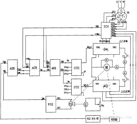 控制電路主要由轉(zhuǎn)速調(diào)節(jié)器ASR、電流調(diào)節(jié)器ACR、環(huán)流調(diào)節(jié)器ARR,正組觸發(fā)器GTD、反組觸發(fā)器GTS、電流反饋器TCV組成(見圖2),其中2組觸發(fā)器的同步信號分別取自與整流變壓器相對應(yīng)的同步變壓器。