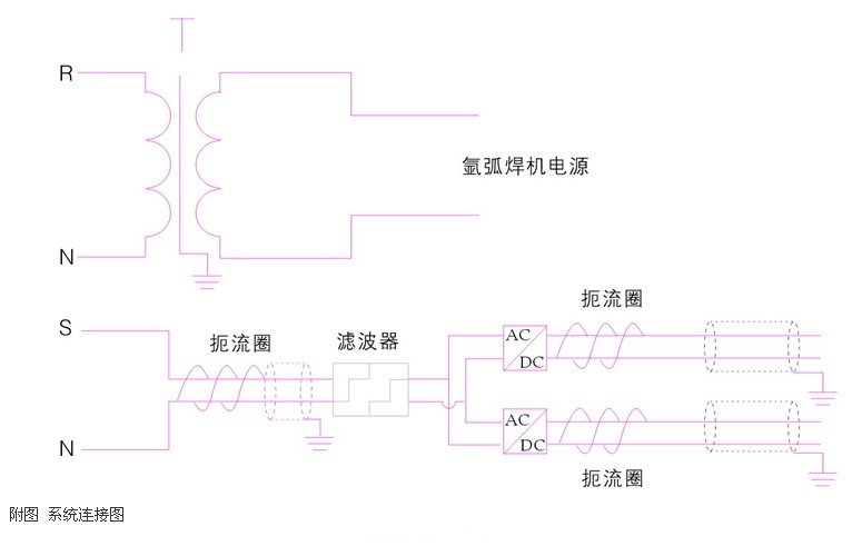 在本案例中,氬弧焊機(jī)電源與伺服驅(qū)動器供電電源分別供給。氬弧焊機(jī)電源用隔離變壓器隔離,伺服電源線外套一個扼流圈后送入有源功率濾波器,經(jīng)過濾波后,再送至開關(guān)電源。伺服驅(qū)動器的動力電源和控制電源用2個開關(guān)電源分別供電,且在接入驅(qū)動器前分別套一個扼流圈。驅(qū)動器電源與控制(編碼器)電源均連接了屏蔽線,并確保單端可靠接地。如附圖為系統(tǒng)接線圖。