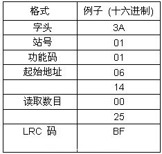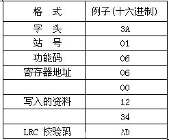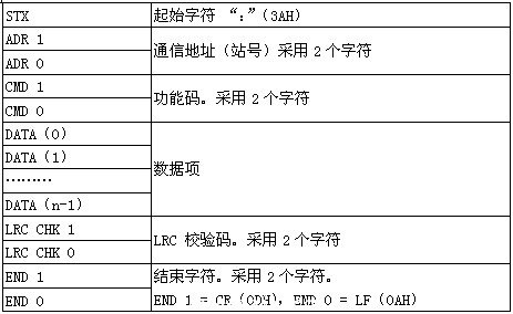 Modbus 分為ASCII和RTU兩種,ASCII采用的格式和校驗(yàn)相對(duì)簡單,本文采用ASCII格式,并僅對(duì)使用的功能碼進(jìn)行說明,更多的信息,請(qǐng)參看協(xié)議的詳細(xì)說明。