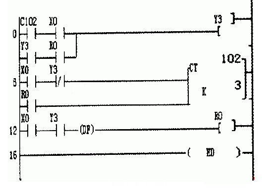 程序1調(diào)試結(jié)果:X0接通3次,Y3接通,X0再接通1次,Y3斷開(kāi)。