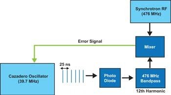 因?yàn)樽杂呻娮蛹す馄?/span>FEL 沒有諧振腔并且是一個(gè)單通的設(shè)備,需要一束非常明亮的激光束來達(dá)到增益飽和狀態(tài)。有時(shí)這是通過使用傳統(tǒng)的超快激光源(如的Nd:YLF 或摻鈦藍(lán)寶石),激發(fā)在加速的射頻區(qū)域中的光電陰極,充當(dāng)電子注射器來實(shí)現(xiàn)的。通過超快激光鎖定到主時(shí)鐘得到同步信號(hào)。主時(shí)鐘正在控制直線性加速器。