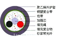 產品型號: GYSTS也叫(GYTS) 光纖松套管金屬中心加強件纜芯填充油膏軋紋鋼帶粘結PE護套