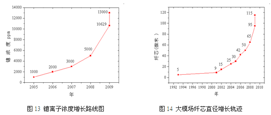 烽火通信采用自主知識(shí)產(chǎn)權(quán)的專利技術(shù),實(shí)現(xiàn)了稀土離子摻雜技術(shù)突破,鐿離子濃度迅速突破13000ppm(見(jiàn)圖13所示),雙包層摻鐿光纖的纖芯直徑迅速突破100微米的技術(shù)關(guān)隘,達(dá)到115微米(見(jiàn)圖14所示)。