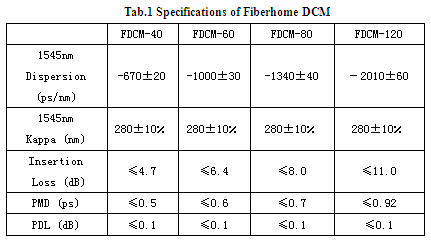 烽火通信科技股份有限公司采用自主知識(shí)產(chǎn)權(quán)的PCVD裝備與工藝技術(shù),獨(dú)立開(kāi)發(fā)出商用化的色散補(bǔ)償光纖及光纖型補(bǔ)償模塊,成功應(yīng)用在國(guó)內(nèi)10G和40G通信系統(tǒng)中,并批量出口。表1為其色散補(bǔ)償光纖模塊的性能指標(biāo)。