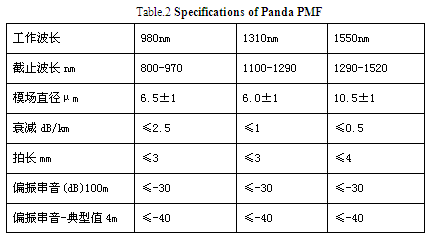 國(guó)際上,目前有各種類型的保偏光纖產(chǎn)品進(jìn)入市場(chǎng),知名的保偏光纖制造公司有生產(chǎn)領(lǐng)結(jié)型保偏光纖的FiberCore公司,有生產(chǎn)橢圓包層保偏光纖的3M公司,以及生產(chǎn)熊貓型保偏光纖的Fujikura,Corning ,Nufern、YOFC和OFS等公司。所有的這些公司生產(chǎn)的保偏光纖都具有良好的雙折射性能。目前市場(chǎng)需求量為5000km,市場(chǎng)容量在5000萬(wàn)元左右,國(guó)內(nèi)對(duì)保偏光纖的需求量逐年增大,表2為典型的熊貓型保偏光纖的技術(shù)指標(biāo)。