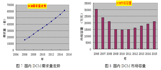 高速大容量光通信系統(tǒng)需求的寬帶色散補(bǔ)償光纖及其器件(DCM)成功商用,實(shí)現(xiàn)C波段的色散和色散斜率的雙功能補(bǔ)償,并且大規(guī)模應(yīng)用在波分復(fù)用(WDM)及OTN光通信系統(tǒng)中,解決了該器件依賴于進(jìn)口的局面。隨著密集波分系統(tǒng)的規(guī)模化建設(shè),國(guó)內(nèi)對(duì)色散補(bǔ)償光纖模塊的需求量迅速增長(zhǎng),預(yù)計(jì)到2015年國(guó)內(nèi)需求將達(dá)到60000套(見(jiàn)圖7),市場(chǎng)容量將達(dá)到2.2億元(圖8)。