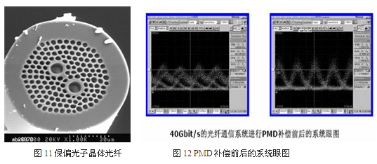 常規(guī)保偏光纖大多采用預(yù)制棒鉆孔的方法,然后置入應(yīng)力硼棒,形成應(yīng)力雙折射。光子晶體光纖科學(xué)技術(shù)的出現(xiàn),為保偏光纖技術(shù)提供了新的途徑。目前,國(guó)外已經(jīng)開(kāi)始了光子晶體PMF的研究,利用氧化硅一空氣之間的折射率反差大,容易獲得高雙折射,研制出了保偏光子晶體光纖(PCF).英國(guó)巴斯大學(xué)報(bào)道了其研制的高雙折射PCF,利用相同直徑不同壁厚的毛細(xì)管組合成預(yù)制棒,實(shí)現(xiàn)不同的微孔直徑.光纖外直徑125μm、節(jié)距1.46μm、小孔直徑0.54μm、大孔直徑1.14μm、在1 550 nm 的拍長(zhǎng)為410μm ,雙折射B =3.8 x 10^-3 ,約為目前熊貓型PMF的10倍.Theis P.hansen利用光子晶體光纖可以高設(shè)計(jì)自由度的優(yōu)勢(shì),在光纖中引入雙纖芯,微孔點(diǎn)陣呈現(xiàn)三角形點(diǎn)陣,研制的光子晶體PMF雙折射達(dá)到1.0x10^-3 .目前研制的光子晶體PMF在1 550 am 窗口的損耗為1.3 dB/km,并以10 Gbit/s的速率進(jìn)行1.5 km的傳輸系統(tǒng)試驗(yàn)?!》榛鹜ㄐ旁趪?guó)家科技計(jì)劃的支撐下開(kāi)展了光子晶體保偏光纖的研究,制備出如圖11所示的保偏光子晶體光纖,其模雙折射B=3.1x10^-3。并進(jìn)行了10G通信系統(tǒng)的PMD補(bǔ)償試驗(yàn)研究:圖12中的左圖表示系統(tǒng)沒(méi)有進(jìn)行PMD補(bǔ)償時(shí)的眼圖,系統(tǒng)的固定DGD為16ps,可以看出信號(hào)嚴(yán)重地受到系統(tǒng)PMD的影響而不能正常工作;采用圖11所示的保偏光子晶體光纖對(duì)系統(tǒng)進(jìn)行PMD補(bǔ)償后,圖12中的右圖顯示通信系統(tǒng)的眼圖睜開(kāi),系統(tǒng)恢復(fù)正常工作。