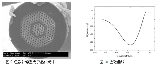 常規(guī)色散補(bǔ)償光纖模塊對(duì)G.652光纖的補(bǔ)償比率在1:8~1:10,如果采用光子晶體前沿技術(shù)進(jìn)行補(bǔ)償,理論上可以達(dá)到1:100的補(bǔ)償比率,實(shí)現(xiàn)色散的高效補(bǔ)償。烽火通信在國(guó)家科技計(jì)劃的支撐下,研制出高負(fù)色散光子晶體光纖(見(jiàn)圖9)。該光纖測(cè)試的色散曲線見(jiàn)圖10所示,其峰值波長(zhǎng)為1570nm,峰值負(fù)色散為-666.2ps/nm.km,其補(bǔ)償帶寬為40nm,補(bǔ)償比率3倍以上。