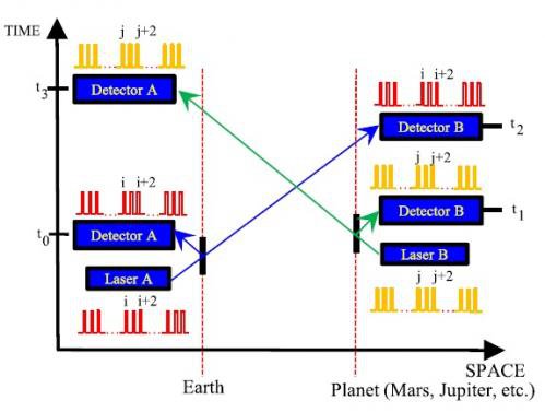 主動激光測距地球和行星之間的空間 - 時間圖。該系統(tǒng)收發(fā)器兩端均采用有源激光器,所以比無源收發(fā)器的信號更強,可以實現(xiàn)遠距離激光測距。