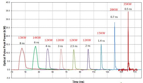 圖3 500皮秒的峰值功率超過35KW (1MHz), 700皮秒的峰值功率超過28KW (1MHz), 脈沖寬度在1ns到10ns范圍的峰值功率控制在12KW-15KW范圍