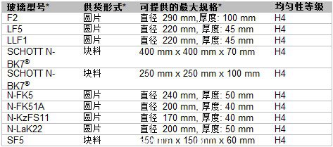 肖特先進光學目前擁有的材料庫存和可提供的最大規(guī)格如下: