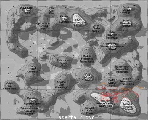 采用Aureka軟件的數(shù)據(jù)挖掘功能繪制技術的重點和熱點分布地形圖(如圖3)。圖中等高線山脈表示國際技術的研發(fā)重點,其重要程度用顏色加以區(qū)分,由淺咖啡色、灰色到白色,依次增強。由圖可知,在光通信領域中,國際上對波長多路輸出、網(wǎng)絡終端、網(wǎng)絡連接器、光纖、接收設備等技術進行了重點研發(fā)。