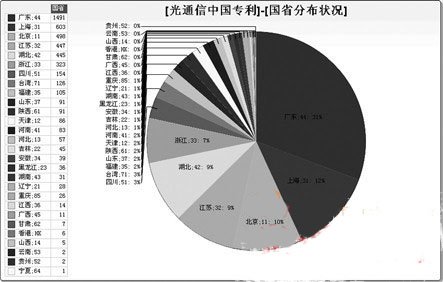 由圖9可知,國內(nèi)申請前五位的省市分別為廣東省、上海市、北京市、江蘇省、湖北省。這五個省市分別有一些代表申請人:廣東的華為、中興通信;上海的交大、貝爾;北京的北郵;江蘇的長飛光纖光纜、亨通;湖北的烽火??梢姡虾?、北京主要以高校研發(fā)為主,專利轉向產(chǎn)業(yè)化稍困難;而廣東、江蘇、湖北以企業(yè)本身研發(fā)為主,因此有利于產(chǎn)業(yè)化。