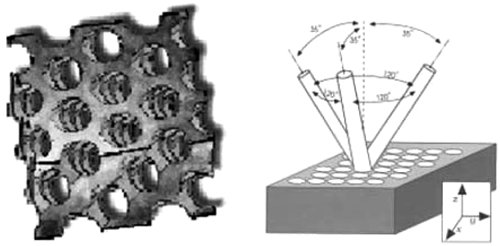 圖5. 第一個(gè)具有絕對(duì)能隙的光子晶體,及其經(jīng)過(guò)特別設(shè)計(jì)的製作方式