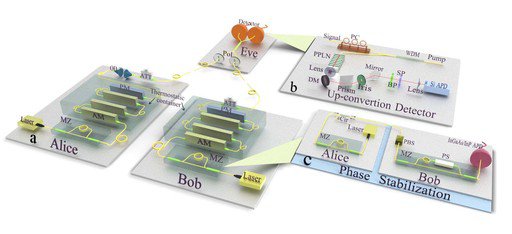 日前,中國科學(xué)技術(shù)大學(xué)潘建偉院士及其同事張強(qiáng)、陳騰云與清華大學(xué)馬雄峰等組成的聯(lián)合研究小組,利用與美國斯坦福大學(xué)聯(lián)合開發(fā)的高效低噪聲上轉(zhuǎn)換單光子探測器,在國際上首次實(shí)現(xiàn)了測量器件無關(guān)的量子密鑰分發(fā),成功解決了現(xiàn)實(shí)環(huán)境中單光子探測系統(tǒng)易被黑客攻擊的安全隱患,大大提高了現(xiàn)實(shí)量子密鑰分發(fā)系統(tǒng)的安全性。