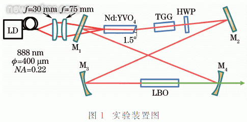 圖1為實(shí)驗(yàn)裝置圖,諧振腔為四鏡環(huán)形腔,其中包含兩個(gè)平面鏡[M1:S1,減反(AR)888nm;S2,高透(HT)888nm,高反(HR)1064nm和M2:S1,HR1064nm]和兩個(gè)凹面鏡(M3:S1,HR1064nm和M4:S1,HR1064nm,HT532nm;S2,HT532nm。犚M3,M4=100mm)。增益介質(zhì)采用α切割的楔形復(fù)合Nd∶YVO4晶體(S1,S2:AR888nm,1064nm),摻雜原子數(shù)分?jǐn)?shù)為0.8%,尺寸為3mm×3mm×(3+20)mm,對(duì)888nm抽運(yùn)光的吸收效率為89%。楔形晶體的設(shè)計(jì)可以起到偏振分束器的作用,在不同偏振方向模式的競(jìng)爭(zhēng)中,保證π偏振光優(yōu)先于σ偏振光在腔內(nèi)起振,提高激光器的線偏振度和偏振方向的穩(wěn)定性。法拉第旋轉(zhuǎn)器(TGG)和半波片(HWP)組成的光學(xué)單向器使激光器實(shí)現(xiàn)單向運(yùn)轉(zhuǎn),獲得穩(wěn)定的單頻輸出。倍頻晶體采用尺寸為3mm×3mm×15mm的LBO晶體(S1,S2:AR1064nm,532nm),通過(guò)自制的控溫儀(控制精度為0.01℃)將晶體溫度控制為非臨界相位匹配溫度149℃。抽運(yùn)源采用光纖耦合輸出的激光二極管(LIMOF400DL888EX1458),中心波長(zhǎng)為888nm,最大輸出功率為90W,光纖芯徑為400μm,數(shù)值孔徑犖犃為0.22。激光二極管輸出的激光光束經(jīng)傳輸效率為96%的望遠(yuǎn)系統(tǒng)整形后聚焦于Nd∶YVO4晶體內(nèi)。
