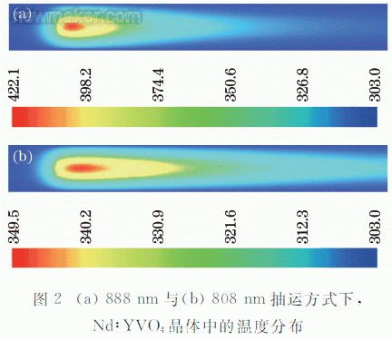 與中心波長(zhǎng)為808nm激光二極管抽運(yùn)相比,采用中心波長(zhǎng)為888nm的激光二極管抽運(yùn)具有兩個(gè)優(yōu)點(diǎn):1)采用888nm直接抽運(yùn)方式減小了量子虧損產(chǎn)生的熱,例如,要獲得1064nm激光輸出,與808nm抽運(yùn)相比,熱負(fù)荷將從24.1%縮減為16.5%,這樣在激光的抽運(yùn)過(guò)程中,增益介質(zhì)會(huì)吸收更多的抽運(yùn)功率而保證熱負(fù)荷不會(huì)增加;2)888nm抽運(yùn)方式無(wú)偏振吸收的特性在降低熱效應(yīng)的同時(shí)也改善了激光器工作的穩(wěn)定性。為了定量地描述晶體的熱效應(yīng),使用LASCAD軟件分析了888nm和808nm抽運(yùn)方式在吸收了相同的抽運(yùn)功率下晶體內(nèi)部的溫度分布。首先,選用摻雜原子數(shù)分?jǐn)?shù)為0.8%,尺寸為3mm×3mm×(3+20)mm的Nd∶YVO4晶體,該晶體對(duì)波長(zhǎng)為888nm抽運(yùn)光的吸收效率為89%。其次,采用摻雜原子數(shù)分?jǐn)?shù)為0.2%,尺寸為3mm×3mm×(3+20)mm的Nd∶YVO4晶體,當(dāng)抽運(yùn)光的波長(zhǎng)為808nm時(shí),Nd∶YVO4晶體對(duì)抽運(yùn)光的吸收效率為95%。圖2為在吸收了相同的抽運(yùn)功率條件下采用兩種抽運(yùn)方式晶體內(nèi)部在橫向和縱向的溫度分布圖。