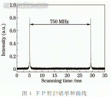 圖4為激光器輸出功率為21.5W時(shí),掃描法布里珀羅(FP)腔得到的單頻曲線,證明激光器實(shí)現(xiàn)穩(wěn)定單頻運(yùn)轉(zhuǎn)。