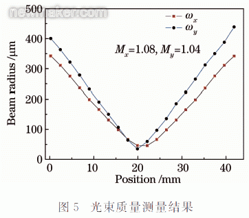圖5為通過(guò)光束質(zhì)量分析儀測(cè)量的光斑分布曲線圖,光光轉(zhuǎn)換效率為31.9%。由實(shí)驗(yàn)結(jié)果可見,888nm直接抽運(yùn)方式和擴(kuò)大激光晶體處基模光斑尺寸,極大地減輕了增益介質(zhì)在高功率抽運(yùn)過(guò)程中產(chǎn)生的嚴(yán)重?zé)嵝?yīng),提高了激光器的輸出功率和光光轉(zhuǎn)換效率。