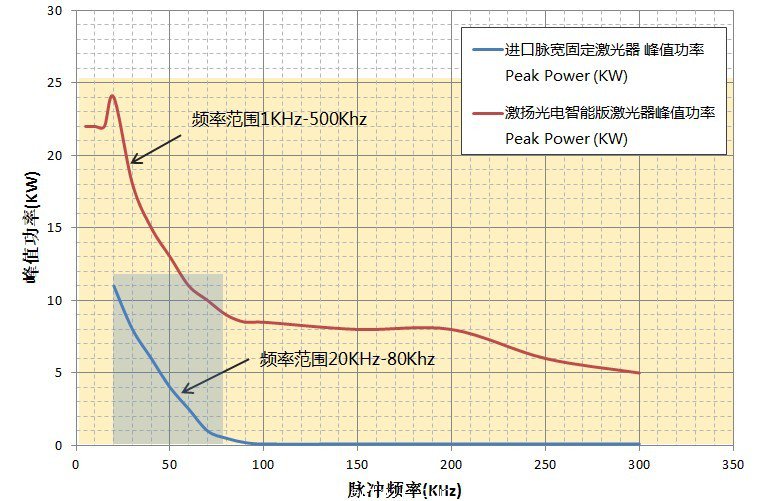 圖2. 智能版激光器的頻率范圍由脈寬固定激光器的20KHz-80KHz范圍(圖中淺藍(lán)色部分)拓展到1KHz-500KHz(圖中淺橙色部分),而且峰值功率保持在較高的水平