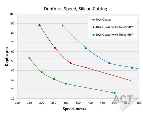 圖3:硅片切割深度與切割速度的曲線圖,圖中顯示了使用TimeShift技術(shù)所實(shí)現(xiàn)的加工優(yōu)化所帶來(lái)的益處。