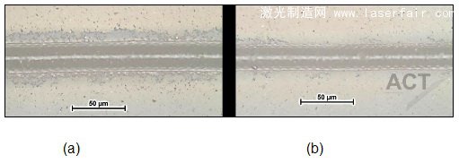 圖4:硅片切割質(zhì)量對(duì)比。(a)利用單脈沖切割的俯視圖,切割深度20mm。(b)利用5個(gè)子脈沖切割的俯視圖,切割深度25mm。