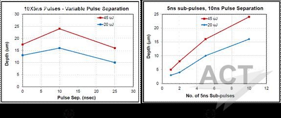 在第一組試驗(yàn)中,能量為20mJ和45mJ的激光脈沖,被分為10個(gè)持續(xù)時(shí)間為5ns的子脈沖,子脈沖之間的時(shí)間間隔是變化的。圖9(a)顯示了試驗(yàn)結(jié)果。間隔為10ns的子脈沖,比具有相同能量的單個(gè)脈沖(0ns間隔),能切割出更深的凹槽。然而,將子脈沖之間的間隔增加至25ns時(shí),其材料去除速率則比單脈沖的情況更低。利用靈活的TimeShift技術(shù),能夠很容易地實(shí)現(xiàn)這樣的加工效果。這能使開(kāi)發(fā)工程師進(jìn)一步了解主導(dǎo)加工結(jié)果的激光與材料之間的相互作用機(jī)制,以實(shí)現(xiàn)加工速度和加工質(zhì)量更迅速和更全面的優(yōu)化。