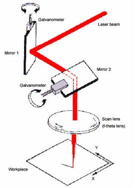 一束激光被兩片掃描振鏡反射,并且通過(guò)一片聚焦鏡。振鏡片在一個(gè)galvo-掃描器馬達(dá)的帶動(dòng)下高速的來(lái)回延軸旋轉(zhuǎn)。在大多數(shù)情況下,最高偏轉(zhuǎn)角鏡是+12.5°(+10°往往是一個(gè)較安全范圍)入射角不能偏于45°。