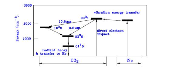 大體上,二氧化碳激光的工作物質(zhì)是由二氧化碳、氦、氮氣所組成的混合物。氮氣作為緩沖氣體以及它的分子共鳴地傳遞刺激能量給二氧化碳分子。因為張弛水平 (01110)是瓶頸,氦的作用是作為熱壑來傳遞能量給水平(01110)給氦原子。