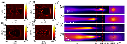 圖2.隨著等離子體密度的漸變,呈現(xiàn)出四種不同的注入、加速方式(左圖,模擬)。實驗中再現(xiàn)了與之一一對應(yīng)的電子能譜和與之緊密關(guān)聯(lián)的回旋輻射前向分布(右圖)。
