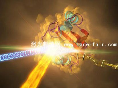 (圖片說明:此圖為光合細(xì)菌中一個蛋白質(zhì)在光線作用下改變形狀的過程,該實(shí)驗(yàn)是在SLAC國家加速器實(shí)驗(yàn)室完成的。圖右為結(jié)晶化蛋白質(zhì)——光敏黃蛋白(PYP),光敏黃蛋白沿著SLAC的直線性連續(xù)加速器光源(LCLS)X射線激光束(左下角火焰般光束)噴射。結(jié)晶化蛋白經(jīng)來自圖左的藍(lán)光照射后已發(fā)生形變。X射線激光擊中結(jié)晶化蛋白質(zhì)所形成的衍射圖使科學(xué)家得以重現(xiàn)蛋白質(zhì)的3D結(jié)構(gòu),并探究光線照射是如何改變其形狀。圖片來源:SLAC National Accelerator Laboratory)