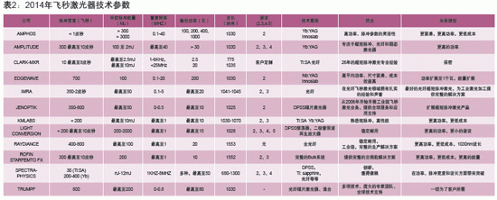 表1展示了皮秒激光器的14家供應(yīng)商,2013年是9家?;静ㄩL仍然是最常見的1030或1064nm。幾個不同的供應(yīng)商能提供的商用皮秒激光器功率最大至100W,具有較高功率的可能使用了Innoslab技術(shù)。大多數(shù)被調(diào)查者都表示至少有第二和第三諧波。行業(yè)整合也一直在進行,例如JDSU收購了Time-Bandwidth以及EO Technics收購了PowerLase。另一個值得注意的是一些“跨界”的存在:2013年,所有供應(yīng)商都將自己劃分為皮秒激光器或是飛秒激光器,但在2014年的表中,許多公司(SP、Amphos、EdgeWave、Rofin和Trumpf)將自己同時劃為皮秒和飛秒激光器的供應(yīng)商。