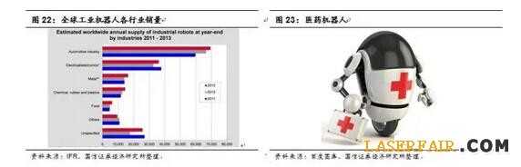 工業(yè)機(jī)器人在汽車(chē)、家電行業(yè)發(fā)展快,服務(wù)機(jī)器人在醫(yī)藥領(lǐng)域的應(yīng)用值得期待。