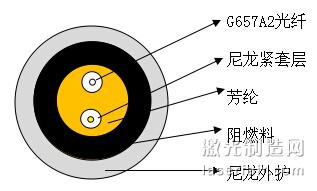 為了滿足客戶對光纜外徑7.0mm及防鼠咬的要求,光纜結(jié)構(gòu)采用的是GG657A2光纖+0.9mm的尼龍緊套層+芳綸+阻燃料+尼龍外護。