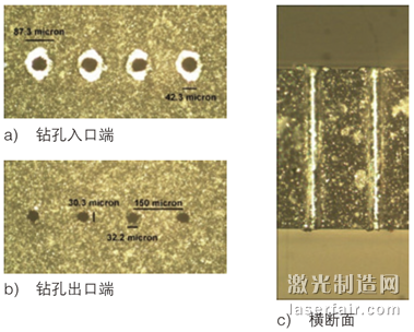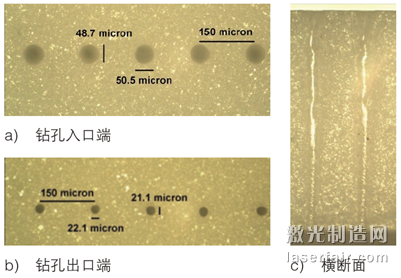 圖1 所示為鉆孔的入口端及出口端。鉆孔出口端以顯微鏡手動測量為22±3 μm,入口端為49±3 μm。基板在操作前已經(jīng)過覆壓,打孔后進行清潔/拋光。