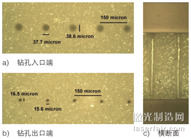 圖2 表示在厚度為381 μm的氧化鋁(99.6%)上以750 孔/s的速度鉆孔后孔的形態(tài)。經(jīng)測量,鉆孔入口端孔徑約37 μm,出口端約16 μm。該實驗使用的是單模光纖。